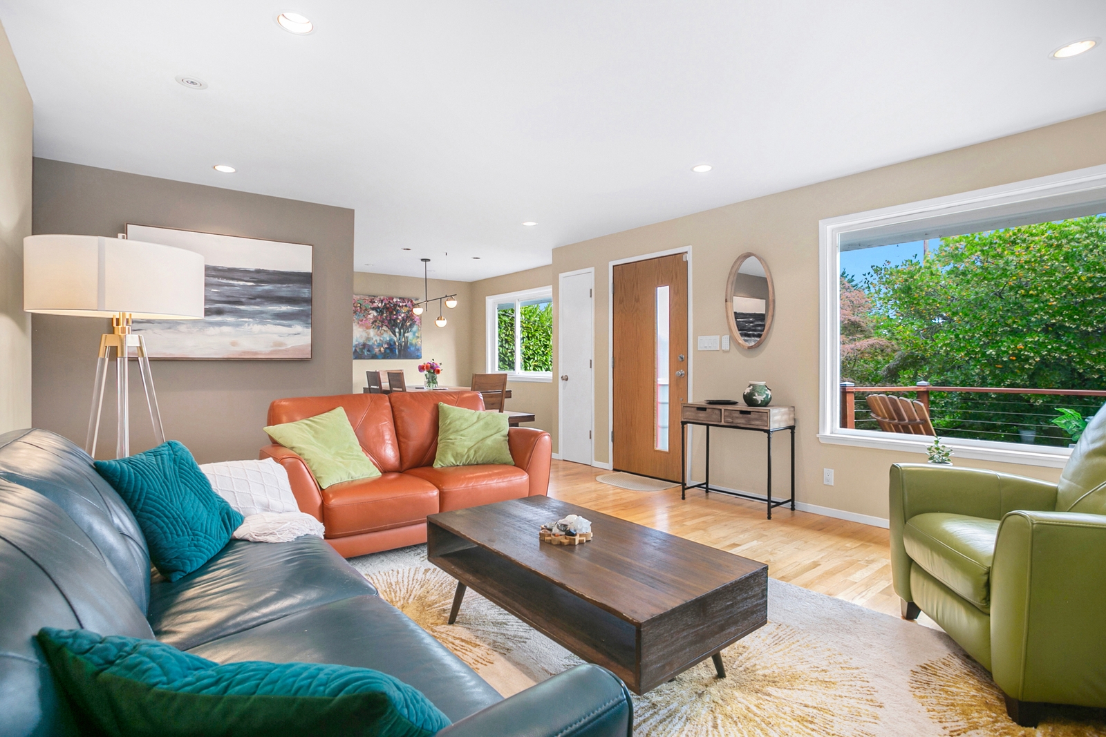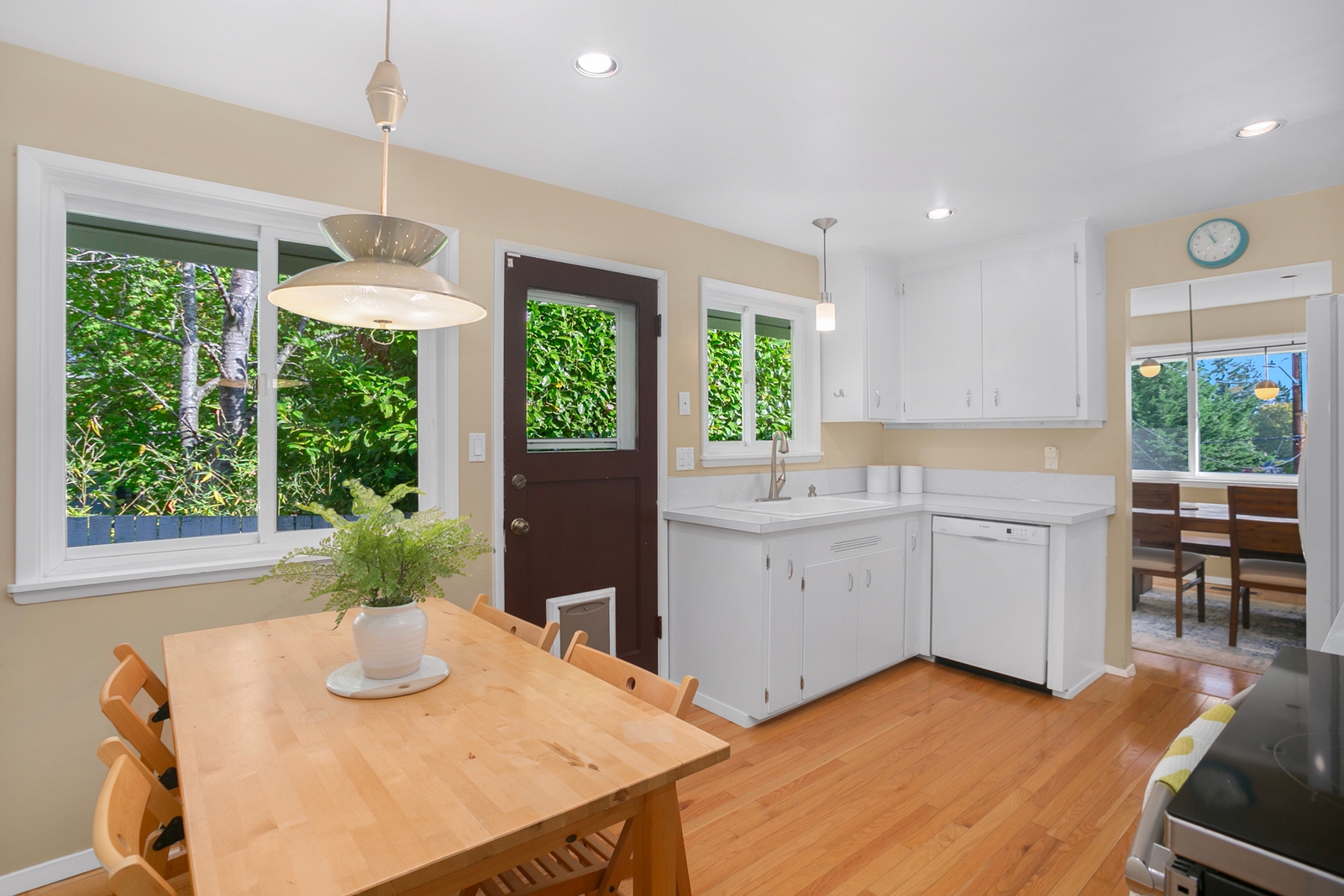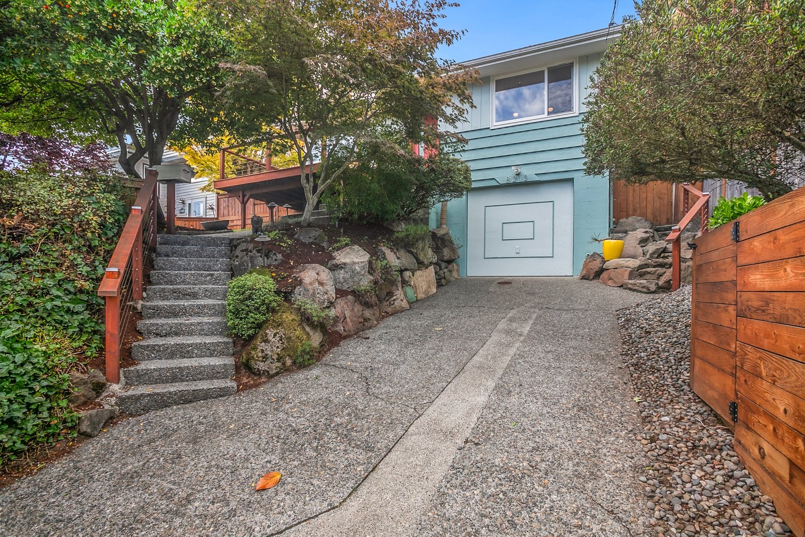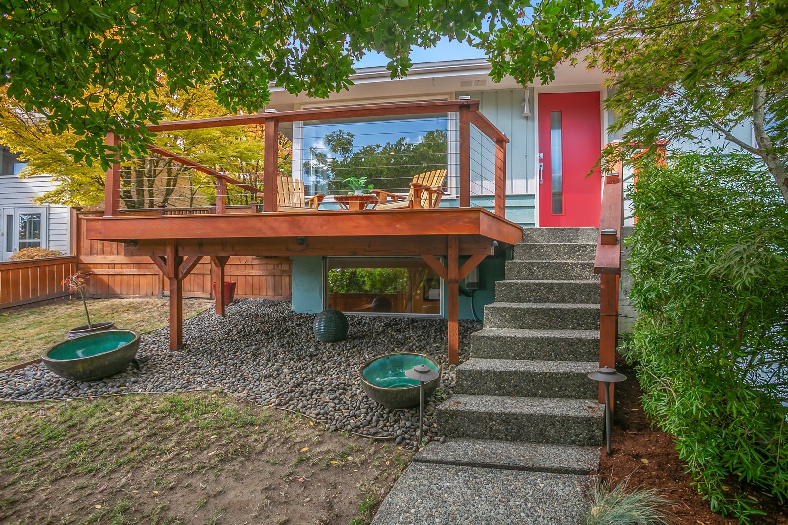 Charming, spacious and private mid-century home. Large picture windows in the living and dining rooms let in great light and look out at trees in the front yard. 3 bedrooms on the main and an office/non-conforming bedroom with a closet downstairs. Kitchen has space for a 2nd eating area. Spacious family room on the lower level has room for a sitting/tv area and more. Relax on the private front deck or the back patio area. Fenced yard with wide side yard to the south. Storage in the 1-car garage and large storage closet downstairs. Updated electrical with smart outlets, new water main, heat pump for efficient heating and cooling, new carpet on lower level, hardwood floors and 2 fireplaces. Close to coffee shops, bars/restaurants and transit.