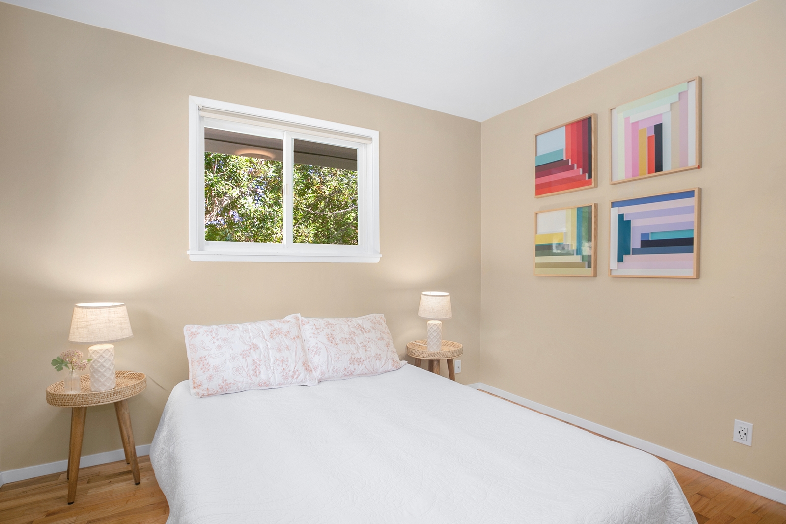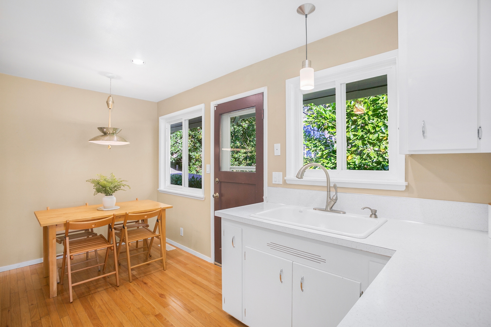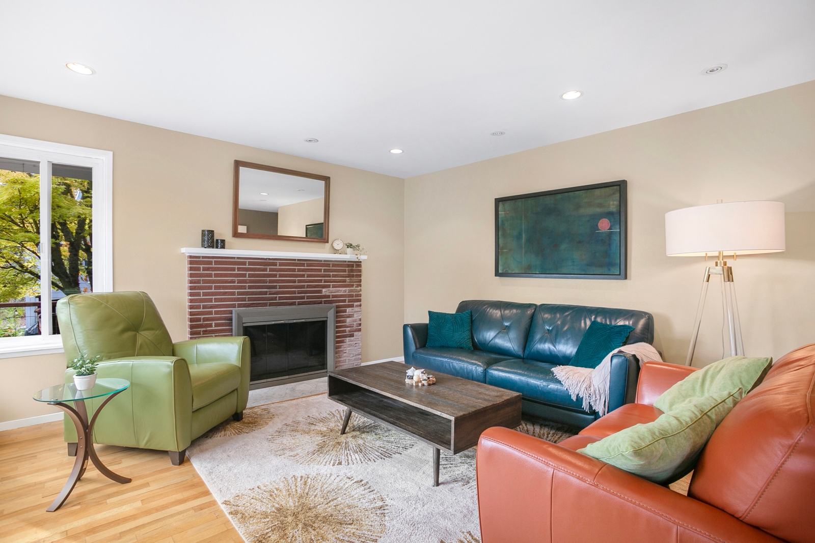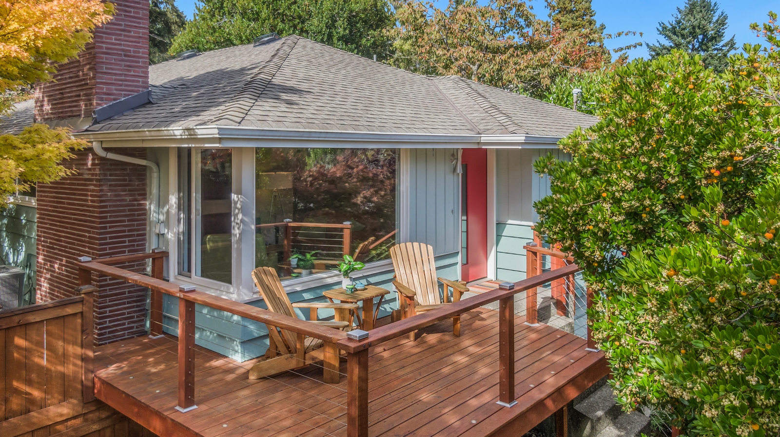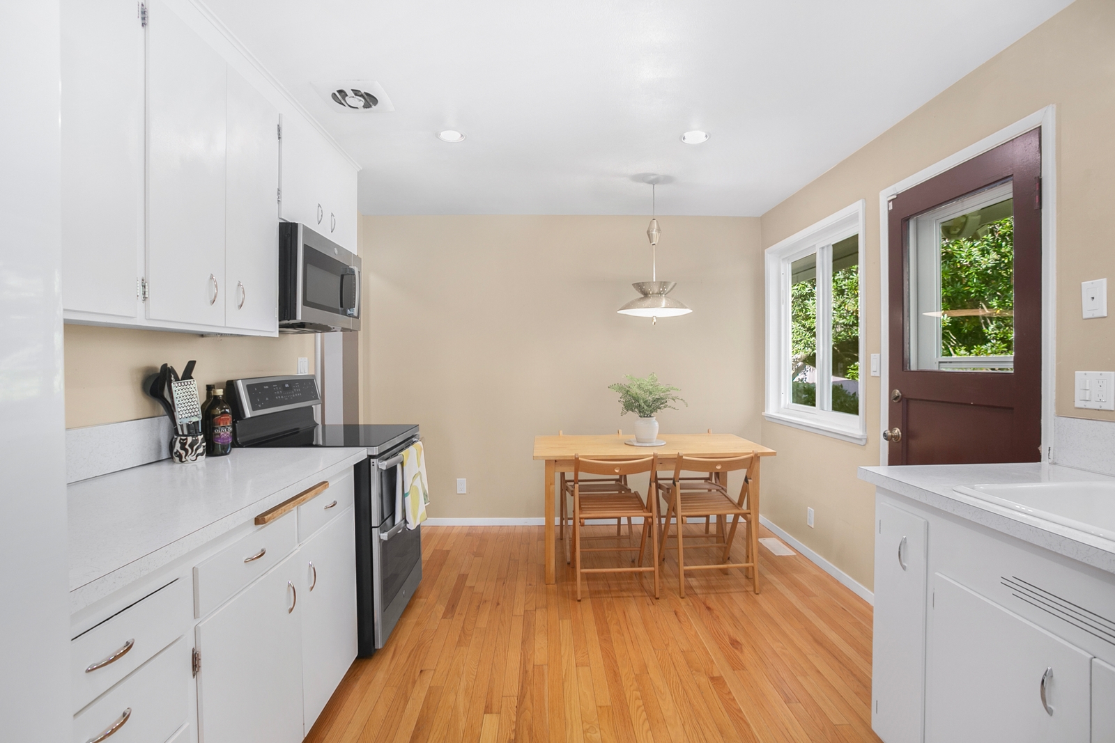 Charming, spacious and private mid-century home. Large picture windows in the living and dining rooms let in great light and look out at trees in the front yard. 3 bedrooms on the main and an office/non-conforming bedroom with a closet downstairs. Kitchen has space for a 2nd eating area. Spacious family room on the lower level has room for a sitting/tv area and more. Relax on the private front deck or the back patio area. Fenced yard with wide side yard to the south. Storage in the 1-car garage and large storage closet downstairs. Updated electrical with smart outlets, new water main, heat pump for efficient heating and cooling, new carpet on lower level, hardwood floors and 2 fireplaces. Close to coffee shops, bars/restaurants and transit.